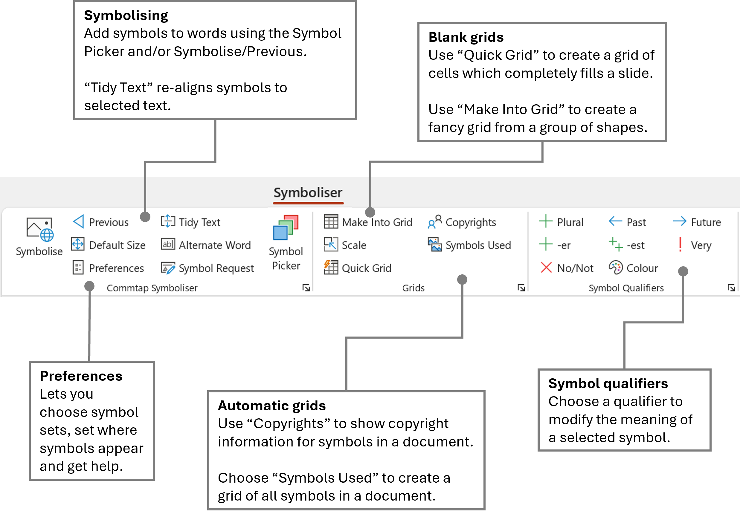 The key parts of the Symboliser tab on the PowerPoint ribbon.
