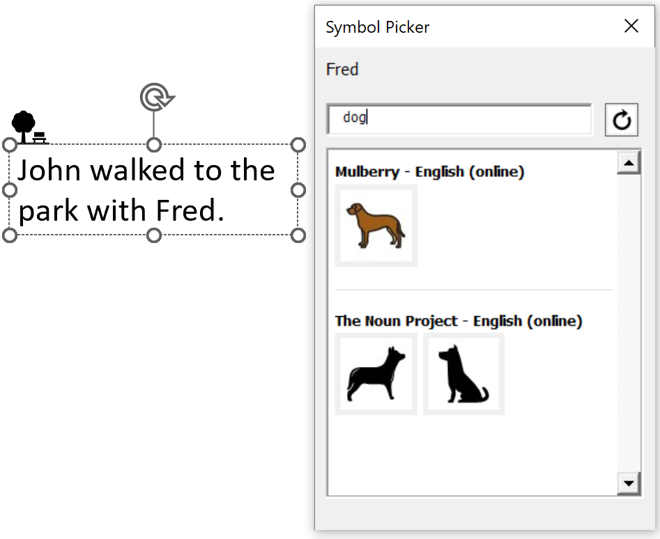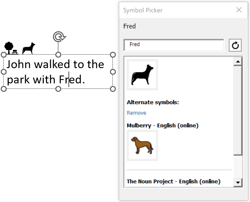 Next time you click on the same word, you will get offered the alternate symbol you searched for previously - in this case clicking on "Fred" will give you symbols for "dog".