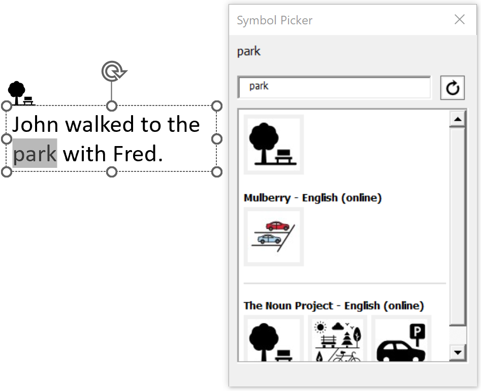 - If the symbol is associated with a text box, you can choose different symbols for that word - but you won't be able to use the search box.
