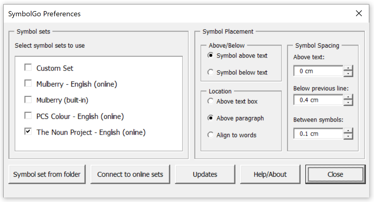 To make changes to where symbols appear, open "preferences" from the SymbolGo group in the ribbon: